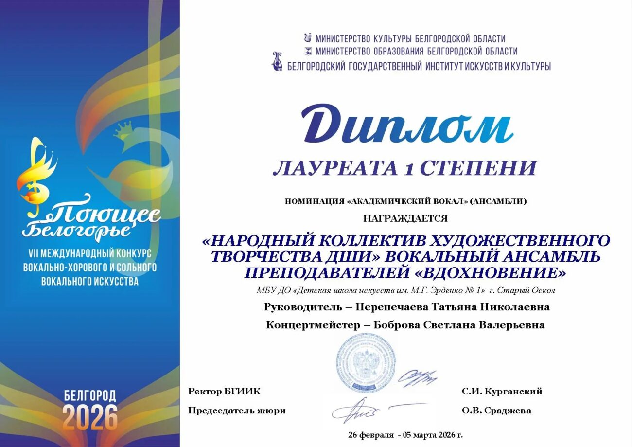 Мы рады приветствовать вас на официальном сайте Муниципального бюджетного учреждения дополнительного образования «Детская школа искусств им. М.Г. Эрденко №1» г.Старый Оскол Старооскольского городского округа
