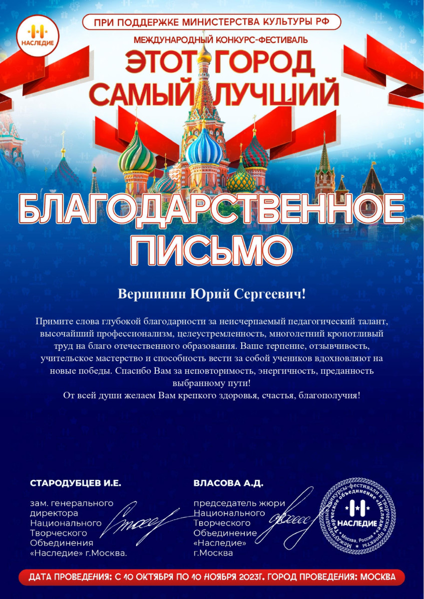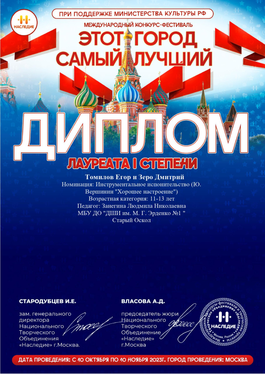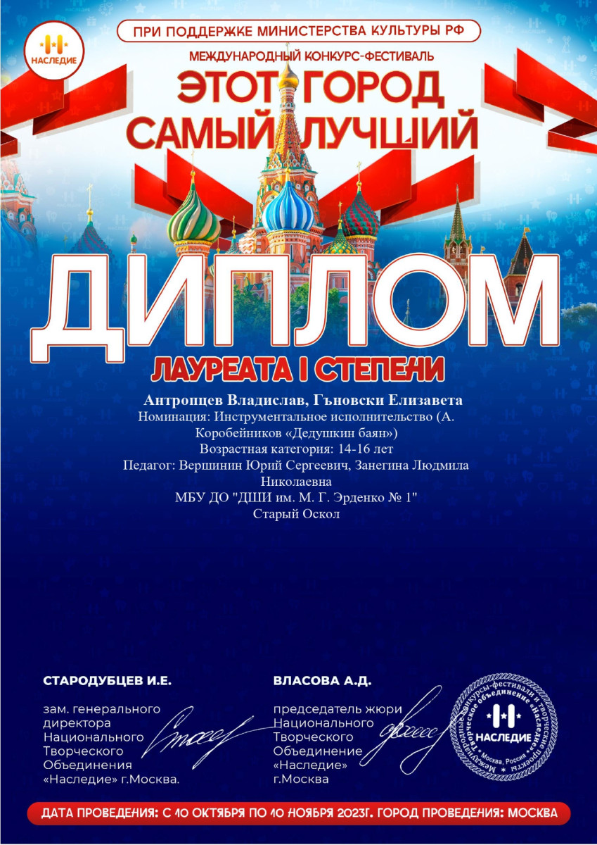 С 10 октября по 10 ноября 2023г. в г. Москва проходил Международный конкурс-фестиваль «Этот город самый лучший». В конкурсе принимали участие учащиеся разных специальностей. От нашей школы выступали учащиеся народного отделения. Поздравляем победителей конкурса.