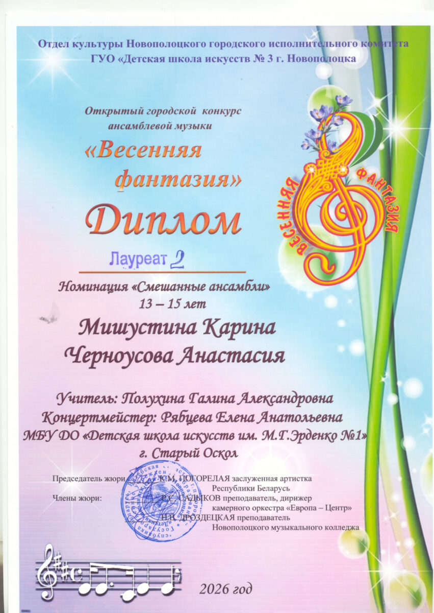 Ансамбль в составе Мишустина Карина и Черноусова Анастасия – Лауреат II степени. преподаватель Полухина Г.А., концертмейстер Рябцева Е.А.