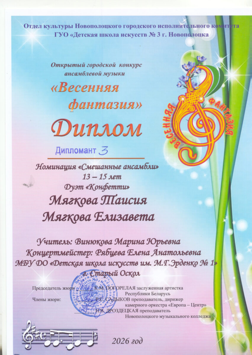 Ансамбль в составе Мягкова Таисия и Мягкова Елизавета – Дипломант III степени, преподаватель Винюкова М.Ю., концертмейстер Рябцева Е.А.
